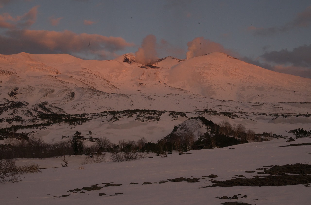 ちょうど、十勝岳に夕日が当たる格好なので、、、