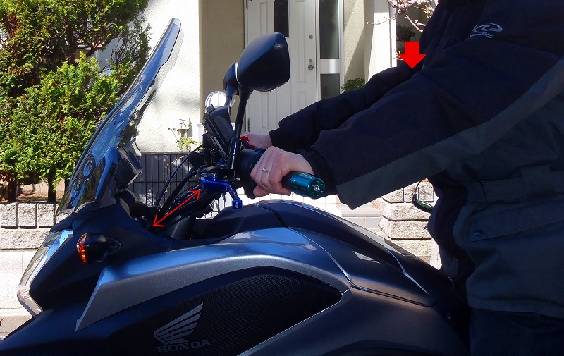 腕の上の太い赤矢印の所と、ブレーキレバー斜め下の細い赤矢印の所を