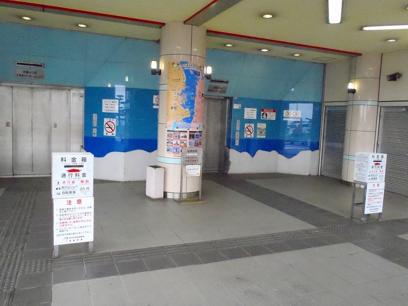 この料金箱の後ろにある、銀色の扉のエレベータで地下に下りますと、
