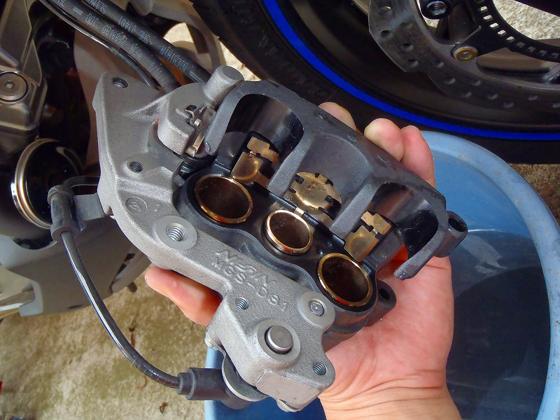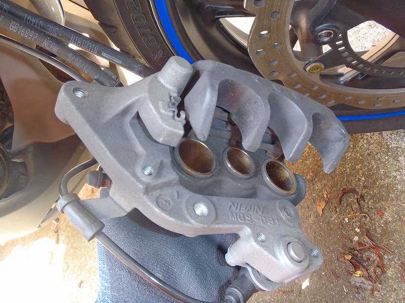 その後、①と②のボルトを外すと、キャリパーが外れます。