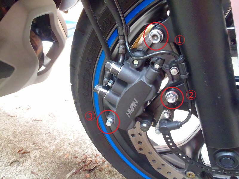 この写真の①~③の番号のボルトを外すことで、キャリパーとパッドを